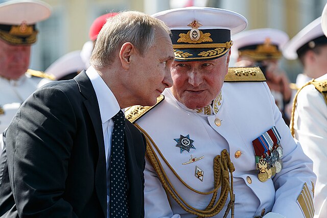 Il presidente della Federazione Russa, Vladimir Vladimirovich Putin (a sinistra) e il comandante in capo della Marina russa, l’ammiraglio Vladimir Ivanovic Korolev (a destra) alla parata navale principale di San Pietroburgo – Fonte – Autore Ministero della Difesa della Federazione Russa File:Putin and Korolyov.jpg – Wikimedia Commons
