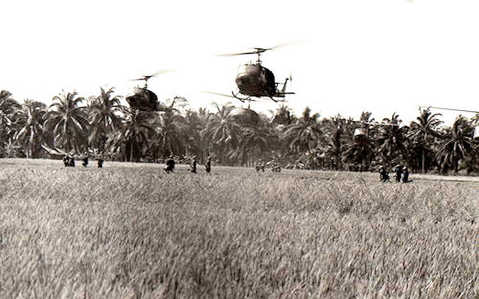 Ero riuscito a realizzare il mio sogno: essere un vero fotografo di guerra, mancavano solo le foto! Venni aggregato ad un plotone, ci divisero in dieci uomini per elicottero e via!, prossimo stop una piccola piazzola tra le risaie e la giungla, una volta sbarcati l’unico rumore a basso volume era la radio che gracchiava in un linguaggio militare fatto solo di sigle, mi diedero un posto nella colonna e iniziammo ad inoltrarci nella giungla: fantastico incominciai a scattare a destra, sinistra, di fronte e dietro, andavo alla grande fino a che passando sotto una grossa foglia non venni assalito da una pattuglia di formiche rosse che velocissime s’infilarono dal colletto e andarono giù dappertutto. Fortunatamente il cavalleggero dietro di me vide la situazione e intervenne. Mi fece spogliare nudo, come la mamma che era a Milano mi ha fatto, e cacciò via le formiche che se ne andarono lasciandomi qualche decina di morsicature.