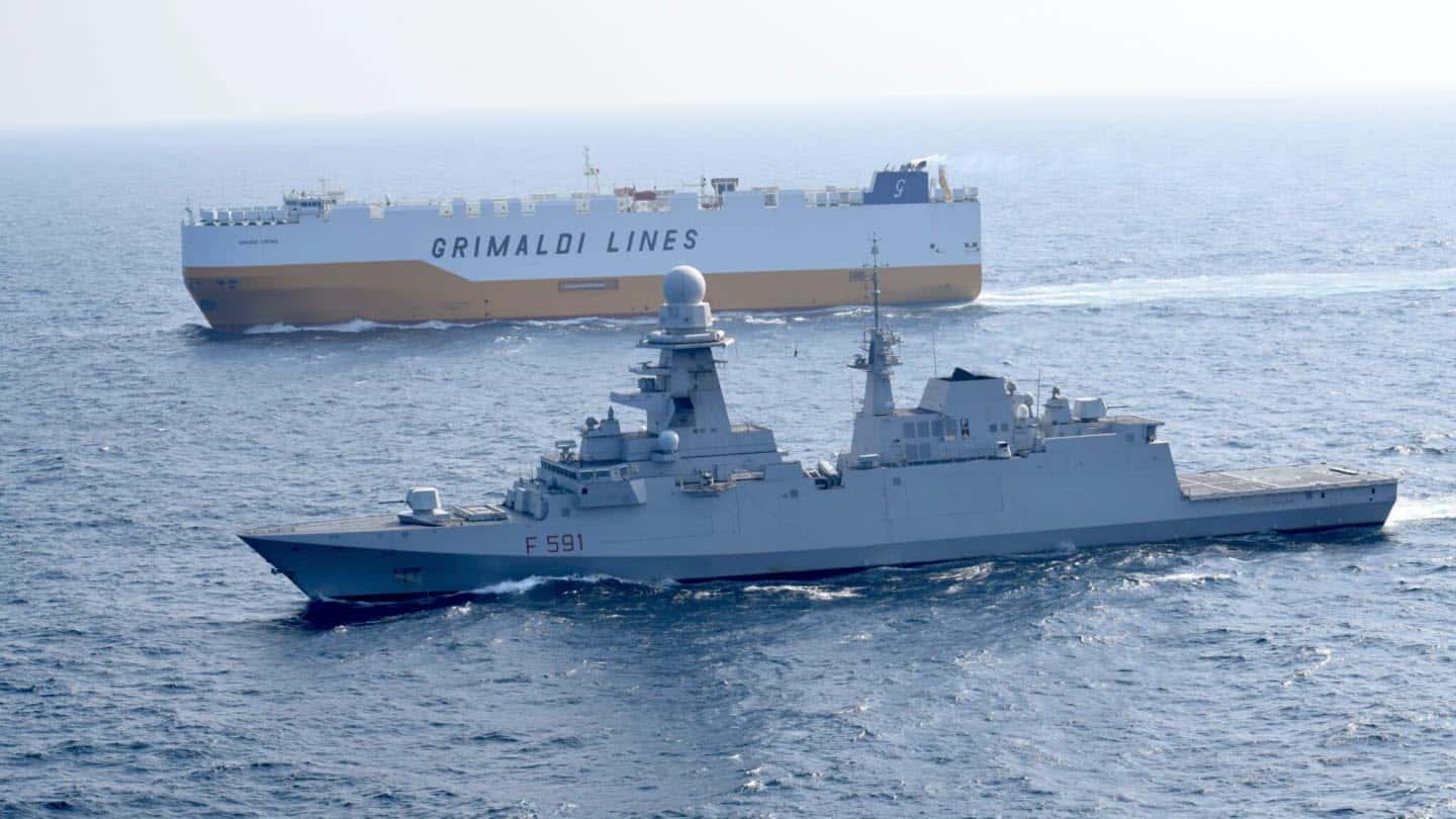 in anteprima: immagine di repertorio: la fregata italiana Fasan F 591 scorta un mercantile italiano della Grimaldi. Un compito che le nostre unità militari stanno svolgendo da molto anni per la sicurezza marittima delle navi mercantili in acque internazionali – photo credit Marina militare italiana