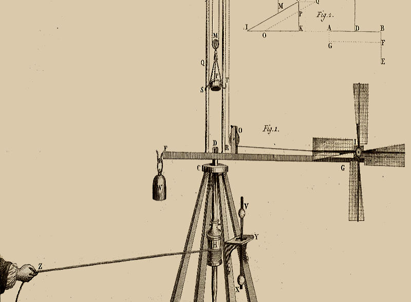 in anteprima, dettaglio di dispositivo per misurare la forza applicata sull’ala di un mulino a vento, John Smeaton, 1759, in “Un’indagine sperimentale riguardante i poteri naturali dell’acqua e del vento per far girare mulini e altre macchine, a seconda di un movimento circolare“. ((https://royalsocietypublishing.org/doi/10.1098/rstl.1759.0019) – dettaglio da Smeaton, 1759, Dispositif de mesure, moulins à vent.png – Wikimedia Commons