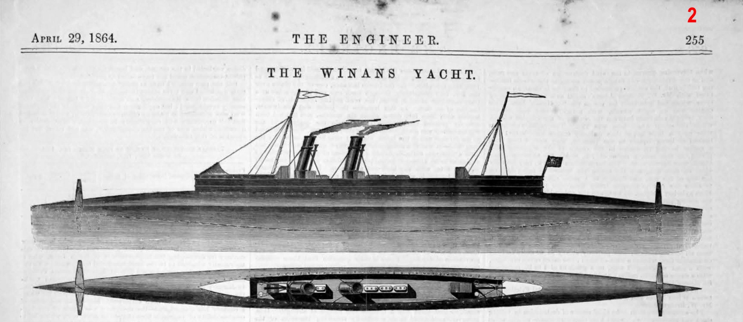 La sua costruzione fu inizialmente affidata al cantiere di John Hepworth ubicato nella cosiddetta Isle of Dogs, in realtà una penisola nell’East End di Londra, ma in seguito i Winans si accordarono con il proprietario per proseguirla direttamente essi stessi affittandone il cantiere. La costruzione del battello, battezzato Ross Winans, dovette subire alcuni ritardi in quanto venne varato, pressoché completo, solamente il 18 febbraio 1866, poche settimane dopo il varo a Le Havre del Walter Winans, con una cerimonia che richiamò un gran numero di spettatori incuriositi. La lunghezza totale dello scafo fusiforme era di 78 m, compresi i due lunghi mozzi conici delle eliche che erano lunghi ciascuno circa 5 m; lo scafo vero e proprio era lungo quindi 68 m e il suo diametro massimo era di 4,8 m; al momento del varo, con macchina e caldaie installate, l’immersione era di 2,4 m che sarebbero aumentati di 73 cm con l’imbarco dei viveri e di 175 t. di carbone, sufficienti per garantirgli un’autonomia di 10 giorni. Il dislocamento a pieno carico era di circa 500-600 t.
