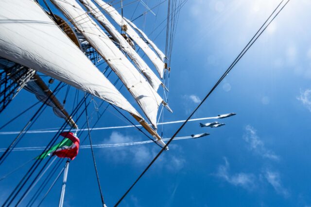in anteprima un’immagine che simboleggia la tradizione (Nave Amerigo Vespucci) e la componente aerea della Marina Militare italiana imbarcata su Nave Cavour (i moderni aerei F 35)