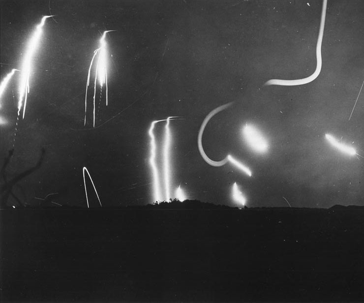 in anteprima illuminanti sparati dalle navi da guerra americane illuminarono durante la battaglia di battaglia di Iwo Jima per prevenire gli attacchi notturni giapponesi, febbraio 1945 – Fonte Navy Naval History and Heritage Command Identification Code  NH 104143 Star shells fired from American warships illuminated Iwo Jima battlefield to prevent Japanese night attacks, Feb 1945 | World War II Database (ww2db.com)