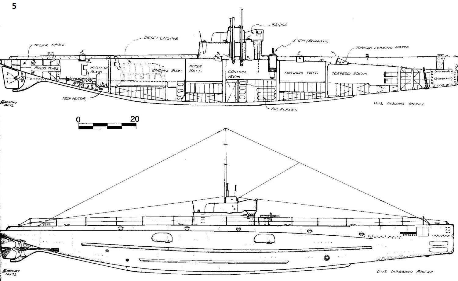 Fig. 5: profilo esterno e sezione longitudinale del sommergibile O-12