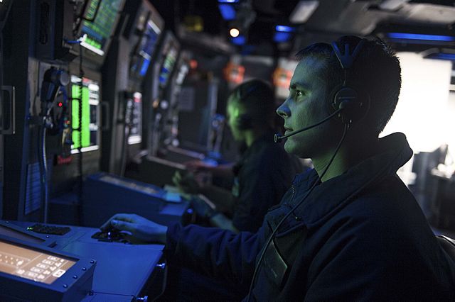 in anteprima: il tecnico sonar di terza classe Michael E. Dysthe di guardia nel centro informazioni di combattimento durante un’esercitazione di guerra antisommergibile a bordo dell’incrociatore lanciamissili di classe Ticonderoga USS Chancellorsville (CG 62) – Foto della Marina degli Stati Uniti di Andrew Schneider, specialista in comunicazioni di massa di seconda classe/pubblicata) 160621-N-XQ474-112 sailor stands watch in the combat information center during an anti-submarine warfare exercise aboard USS Chancellorsville. (27837190745).jpg – Wikimedia Commons .