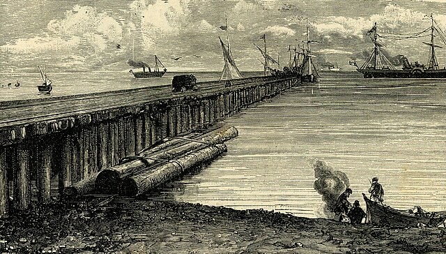 in anteprima il ponte di imbarco alla Maddalena (xilografia), anno 1899 – Fonte L’illustrazione popolare, Fratelli Treves Editori – Milano, 1899 In Sardegna Ponte d’imbarco alla Maddalena (xilografia).jpg – Wikimedia Commons