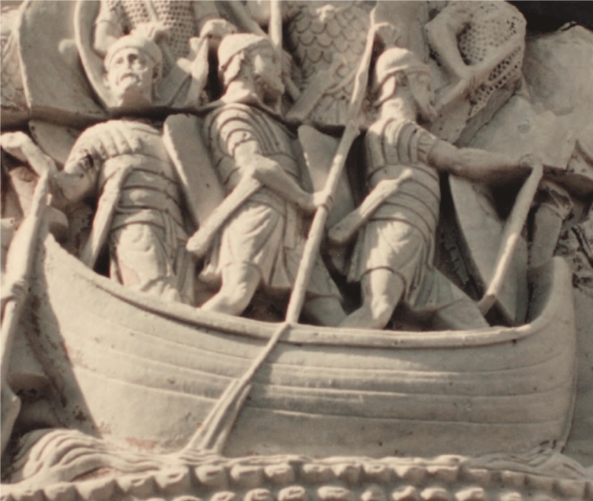 Combattenti romani pronti a sbarcare su di una sponda nemica da un mezzo navale rappresentato in proporzioni ridotte per dare la preminenza alle figure umane, secondo l’uso romano. Scena LXXXI della Colonna di Marco Aurelio, a Roma (foto Domenico Carro)