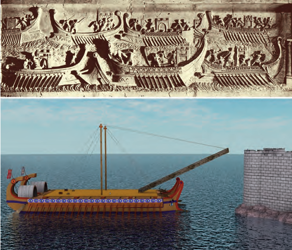 Particolari di una nave nave rostrata romana partecipante alla battaglia navale d’Azio: a) sulla prora spicca una torre di combattimento; b) primo piano dell’armamento di un classiario (elmo, lorica, pterugi e scudo; la scultura spezzata all’avambraccio non ci consente di vedere il gladio che era verosimilmente impugnato con la mano destra) e dell’emblema rappresentato sull’altro scudo ovale (il tridente di Nettuno). Bassorilievo navale proveniente da Palestrina e custodito dai Musei Vaticani (foto R. D’Amato).