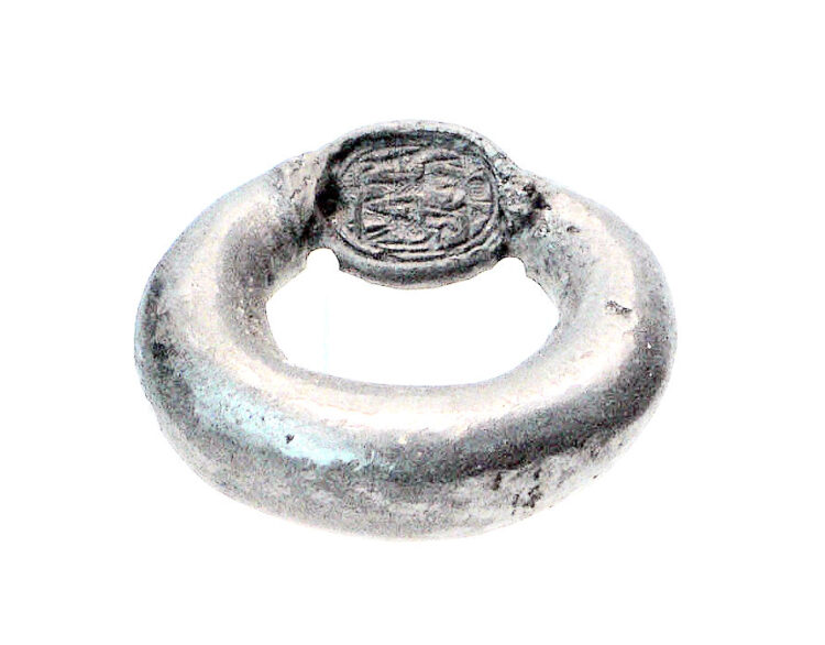 in anteprima anello fenicio in argento con uno scarabeo in pietra ollare incastonato, proveniente dal relitto di Mazarrón II. VII secolo a.C., Museo Nazionale di Archeologia Subacquea (Arqua) di Cartagena – Autore Nano Sanchez Anillo fenicio.jpg – Wikimedia Commons