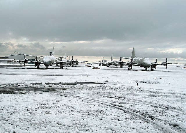 Aerei da pattugliamento marittimo P-3 Orion sulla pista della Stazione Aeronavale di Whidbey Island. Foto della Marina degli Stati Uniti scattata dallo specialista in comunicazioni di massa di prima classe Bruce McVicar US Navy 061127-N-6247M-027 P-3 Orion Maritime Patrol aircraft sit on the runway at Naval Air Station Whidbey Island.jpg – Wikimedia Commons