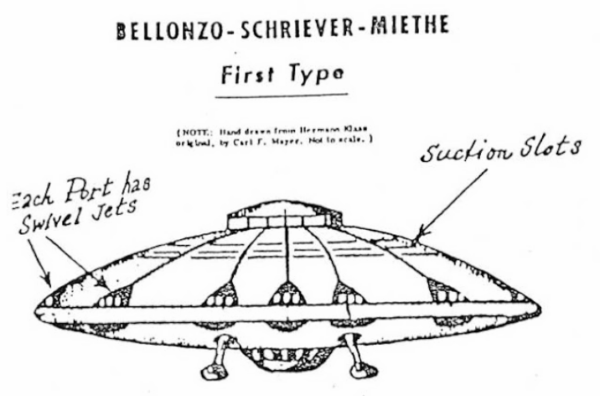 Il primo rapporto non ufficiale sullo sviluppo di questo velivolo si trova in “Die Deutschen Waffen und Geheimwaffen des 2 Weltkriegs und ihre Weiterentwicklung” (Le armi tedesche e le armi segrete della Seconda Guerra Mondiale e il loro successivo sviluppo), J.F. Lehmanns Verlag, Monaco di Baviera, 1956. L’autore di quest’opera dettagliata e tecnica sugli armamenti tedeschi in tempo di guerra fu il Maggiore d.R. Rudolf Lusar, un ingegnere che lavorava presso l’Ufficio Brevetti del Reich tedesco e aveva accesso a numerosi progetti e documenti originali. Lusar dedicò una sezione del capitolo intitolato “Dispositivi speciali” ai progetti di dischi volanti del Terzo Reich. Lusar confermò che insieme ai tecnici tedeschi partecipò al progetto l’ingegnere italiano Belluzzo (erroneamente citato nel documento in inglese Bellonzo) – Disegno di un prototipo di disco volante italo-tedesco – Fonte The Secret Weapons and Facts of the III Reich: The ‘Bellonzo-Schriever-Miethe Disc’