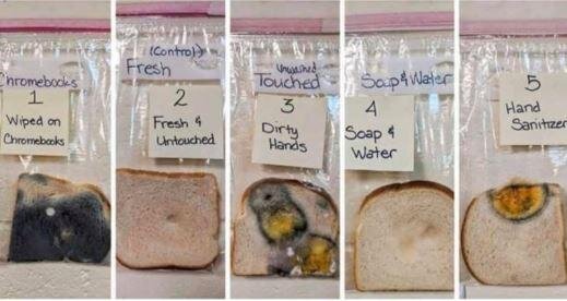 Dopodiché, le fette di pane furono inserite in sacchetti di plastica sigillati e conservati per un mese in un armadio. I risultati, come vedete, dall’immagine, furono sorprendenti. Le fette di pane mostrarono contaminazioni a partire da quella non toccata (2) sempre più evidenti (1 e 3) legate ai contatti ricevuti.
