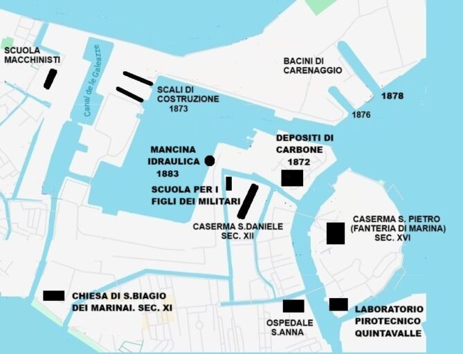 – Quintavalle. Era definito “laboratorio pirotecnico” servendo alla confezione delle munizioni. Certamente, considerando che inevitabilmente c’era anche il deposito delle polveri, trovandosi in piena città poteva costituire un pericolo non da poco. Sorgeva sulla punta meridionale dell’isola di San Pietro di Castello e a differenza delle tante strutture militari veneziane dismesse, questa è ancora in funzione e appartenente alla Marina Militare anche se ovviamente non è più una polveriera, ma è la sede del Comando Zona Fari.