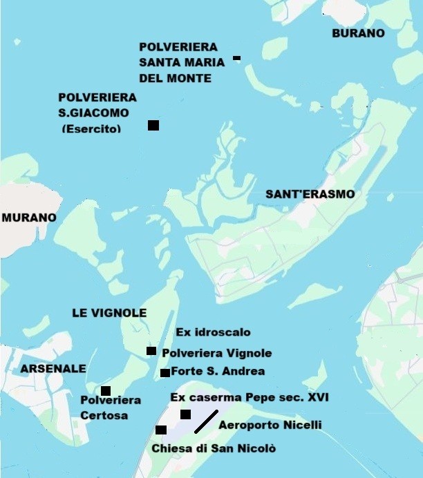 I depositi di polvere della Marina e dell’Esercito erano piuttosto numerosi e sparsi per la laguna per le necessità dei tanti forti e batterie che sorgevano sulle isole. Ne ricordiamo alcuni.