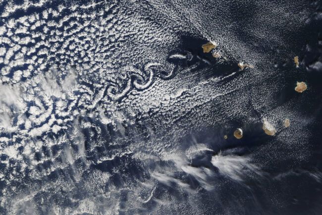 Il filosofo greco Parmenide di Elea, oltre 2.500 anni fa, asseriva che nulla viene dal nulla. L’osservazione con i satelliti ci da la possibilità di osservare dallo spazio gli oceani, mostrandoci fenomeni altrimenti non riconoscibili da terra. Tra di essi abbiamo la formazione di grandi vortici nuvolosi che possono assumere conformazioni particolari a seconda delle interazioni con le strutture geologiche che incontrano sul cammino.