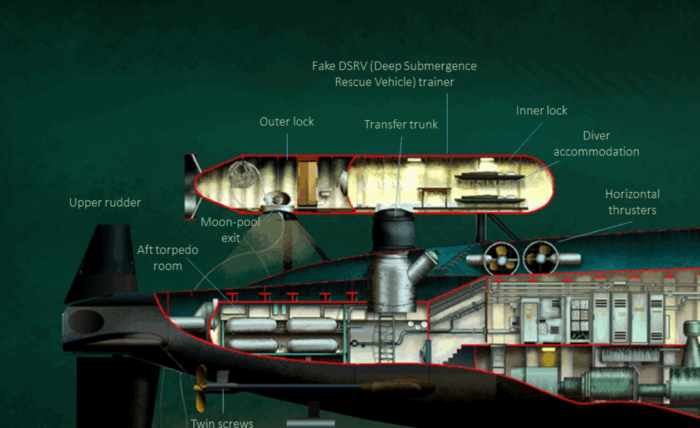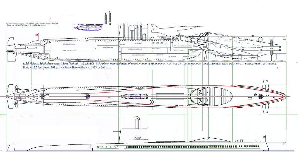 in anteprima un’immagine del USS Halibut prima della trasformazione. Nella sua prima modifica del 1965 mostrava un propulsore montato esternamente (a prua della porta dell’hangar) e non possedeva il cilindro per la componente subacquea. Si ritiene che tale propulsore possa essere stato rimosso quando fu aggiunto il falso DSRV.