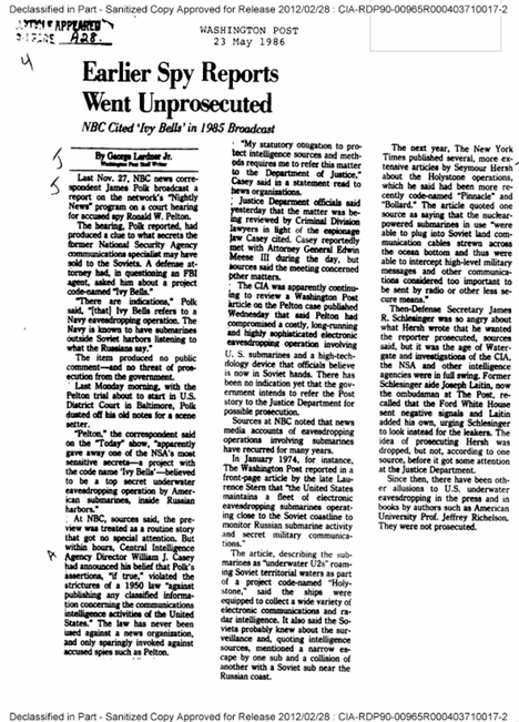 Secondo il Washington Post (1986), il tradimento di Pelton fu reso noto da un corrispondente della NBC, James Polk, durante il programma “Nightly News”; Polk rivelò che un certo Ronald W. Pelton, ex dipendente della NSA, era comparso in tribunale con l’accusa di spionaggio per aver rivelato l’esistenza di un’operazione di spionaggio in acque sovietiche denominata “Ivy Bells“.
