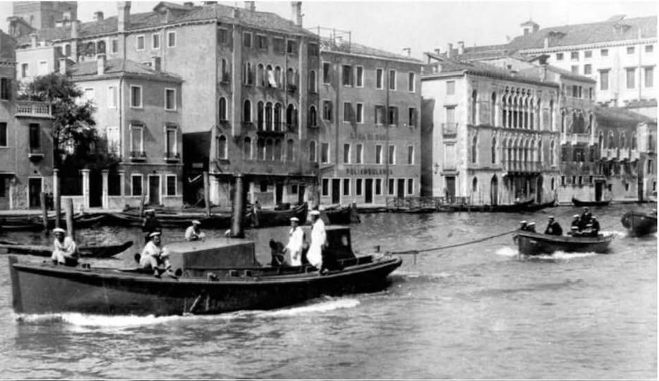 Convoglio trainato da una pirobarca a Venezia – Foto dell’epoca, autore sconosciuto