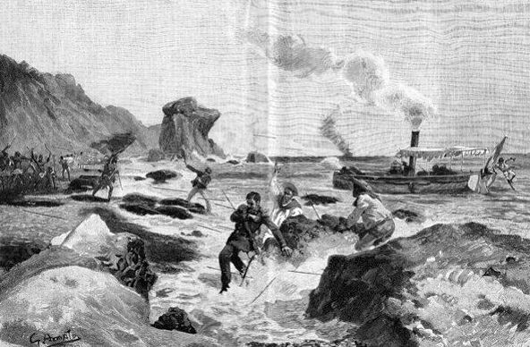 La barca a vapore della Nave Volta tenta di prestare assistenza al Tenente di vascello Carlo Zavalli caduto in un’imboscata a Uarsciek in Somalia nel 1890 3