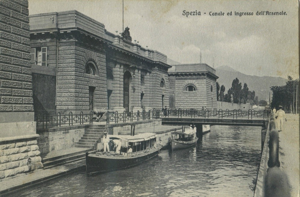Pirobarche per il trasporto del personale all’ingresso dell’arsenale della Spezia – da cartolina