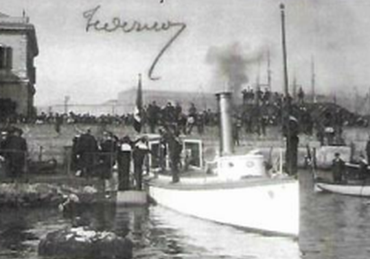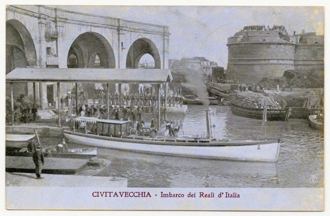 Vittorio Emanuele III sale su una pirobarca a Genova, presumibilmente della Capitaneria – da cartolina dell’epoca