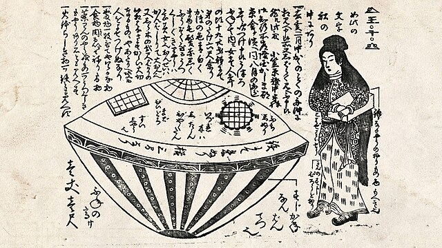 Utsuro-bune – Manjudō la strana barca alla deriva nel feudo del signore Ogasawara da “Hyoryu-ki-shu (Archivi dei naufraghi)” Tardo periodo Edo (XIX secolo) Utsuro-Bune-Manjudō-Drifted-Ashore-on Fief-of-Lord-Ogasawara.png – Wikimedia Commons