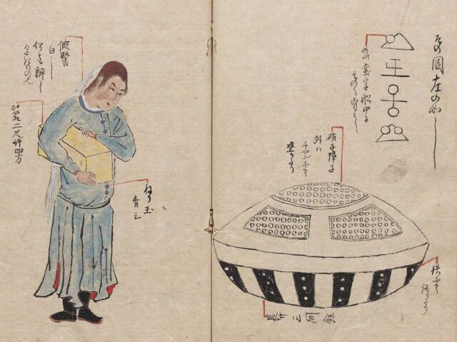 La storia che andiamo a raccontare oggi ci porta nel Giappone dell’inizio del XIX secolo. Il 22 febbraio 1803, alcuni pescatori sulla costa di Harayadori nella provincia di Hitachi, trovarono una strana imbarcazione alla deriva in mare, da una forma ben diversa da quelle locali. Per spirito di solidarietà marinara, trainarono la strana barca a terra, descrivendola come alta 3,30 metri e larga 5,45 metri. La sua forma ricordava un kōro (incensiere giapponese), con la parte superiore realizzata in legno laccato di rosso e quella inferiore ricoperta da lastre di metallo.