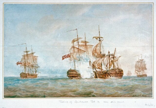 Napoleone conquistò Malta nel 1798, mentre era in rotta per invadere l’Egitto, e i francesi ne mantennero il possesso fino a quando un rigido blocco navale non la consegnò in mano britannica nel 1804. Nel 1800 l’ammiraglio francese Decres tentò di fuggire dall’isola a bordo della “Guillaume Tell” da 80 cannoni (al centro a destra), una delle due principali navi francesi che erano sfuggite alla distruzione o alla cattura nella battaglia del Nilo due anni prima. Fu intercettata e catturata dal capitano Edward Berry a bordo della “Foudroyant” da 80 cannoni (al centro a sinistra), l’ammiraglia di Nelson dopo la battaglia del Nilo insieme della “Lion” da 64 cannoni (all’estrema sinistra) e della fregata “Penelope” da 36 cannoni (all’estrema destra). https://commons.wikimedia.org/wiki/File:The_capture_of_the_%27Guillaume_Tell%27,_31_March_1800_RMG_PW5878.tiff