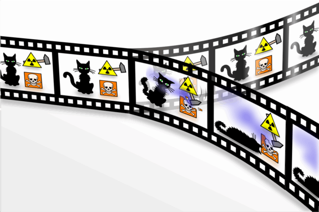 Secondo l’interpretazione a “molti mondi” della meccanica quantistica, nel paradosso del gatto di Schrödinger quando si apre la scatola si creano due mondi paralleli, uno in cui il gatto è vivo e un altro in cui il gatto è morto. Essa sostiene che ad ogni misurazione la storia del nostro universo si separi in un insieme di universi paralleli, uno per ogni possibile risultato del processo di misurazione. Sebbene non condivisa universalmente, questa teoria apre ad interpretazioni filosofiche interessanti – Autore Christian Schirm https://commons.wikimedia.org/wiki/File:Schroedingers_cat_film.svg