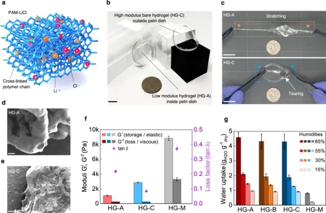 b Fotografie di idrogel PAM-LiCl sintetizzati all’interno e all’esterno di una piastra Petri, che illustrano il contrasto tra i campioni con i moduli di conservazione più alti (HG-A) e più bassi (HG-C).