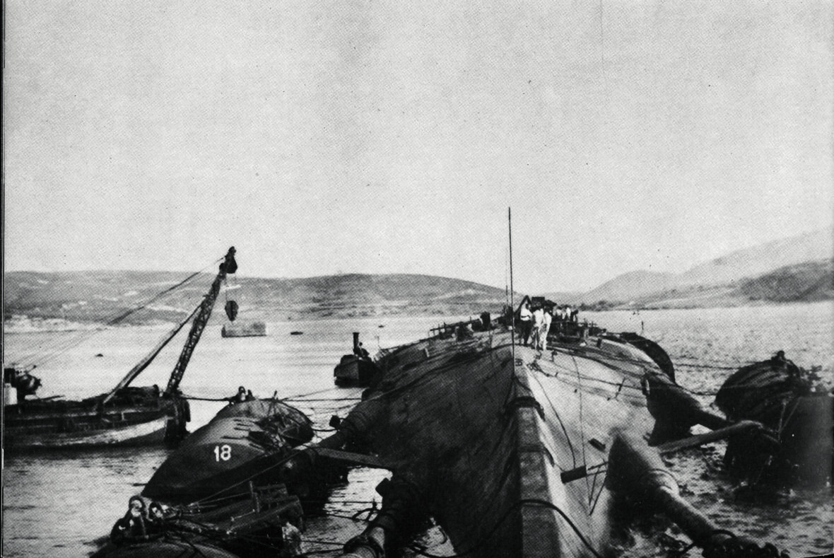 in anteprima il recupero del Trieste a Palau nel 1950, la prima operazione che diede notorietà alla Micoperi: a sinistra si nota lo Squalo, piccolo pontone semovente da 10 t ricavato da un mezzo da sbarco americano – da articolo citato