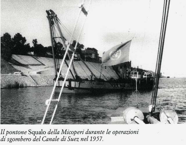Qualche anno salirà a bordo anche l’ammiraglio Agostino Straulino, consigliere d’amministrazione: assaltatore Gamma a Gibilterra, Medaglia d’argento e di bronzo al valor militare nel luglio e settembre 1942 per aver attaccato e affondato a nuoto due piroscafi, nonché leggenda vivente della vela mondiale. Nel 1957 la MICOPERI è selezionata per lo sgombero del Canale di Suez, bloccato dall’affondamento di diverse navi durante la crisi del ’56. Lo Squalo e il Pegaso danno tutto nelle torbide acque del Canale, gli uomini della MICOPERI dimostrano il loro valore ai tecnici di otto Paesi. Il generale americano Raymond Wheleer, direttore della commissione tecnica delle Nazioni Unite, sottolinea che «questi italiani sono dei diavoli. Nel Canale si sono dimostrati i più grandi palombari del mondo».