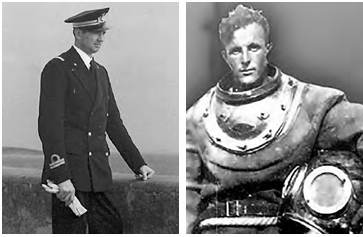 da sinistra, Giovanni Makaus nel 1941 a 28 anni, tenente commissario della Regia marina; il capitano del genio navale Antonio Marceglia, classe 1915, in scafandro da palombaro – da articolo originario su Arbiter nr. 266