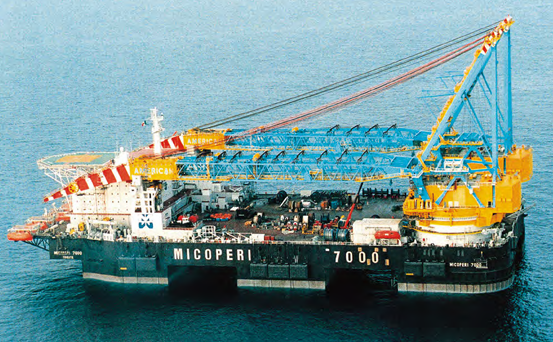 La MICOPERI dunque tra gli anni 60, 70 e la prima parte degli 80 visse un’epoca d’oro, diventando celebre nel mondo. Per tanti anni la sua sede milanese fu in via Borgogna, per poi passare in via Saffi per 20 anni, quindi in piazzale Accursio e infine a Bruzzano. Forse una società di lavori marittimi con sede a Milano suona buffo, ma Giovanni Makaus aveva deciso che bisognava stare vicini alle banche. Oltre al sollevamento si occupava di costruzione di piattaforme petrolifere, posa di oleodotti, lavori portuali, realizzazione di banchine e posa di cemento armato. L’azienda aveva numerose consociate in tutto il mondo, come la SSOS (Sub sea oil services), che faceva lavori subacquei. Per sollevare i pesantissimi carichi si utilizzavano le navi gru, costruite a partire da una petroliera usata: si taglia una fetta centrale per accorciarla, si impiantano sulla prua il sistema gru sopra un basamento molto resistente e sul castello di poppa l’eliporto e si libera la coperta per le varie attrezzature come la gru cingolata o il gruppo elettrogeno. Le piattaforme petrolifere erano fabbricate nei cantieri in cui la MICOPERI aveva associazioni o partecipazioni, che erano posate nel Mare del Nord su fondali medi di 90 metri, e al massimo 180, con jacket (basamenti) a otto gambe pesanti fino a 30mila t; ancorate così saldamente e profondamente nel fondale (anche 150 metri) che sono un problema da sradicare quando si smantella una piattaforma. «La nave arriva», spiega Filippo Makaus, «posa otto ancore che le danno stabilità con delle navi salpa-ancore e poi posa il jacket. Quindi le bettoline portano i moduli da 550-700 t e la gru li monta sulla piattaforma, operazione delicata perché le 2mila tonnellate indicate della gru sono con poco sbraccio, ma se il braccio si allunga la capacità diminuisce. E qui entra in gioco la semisommergibile Micoperi 7000».