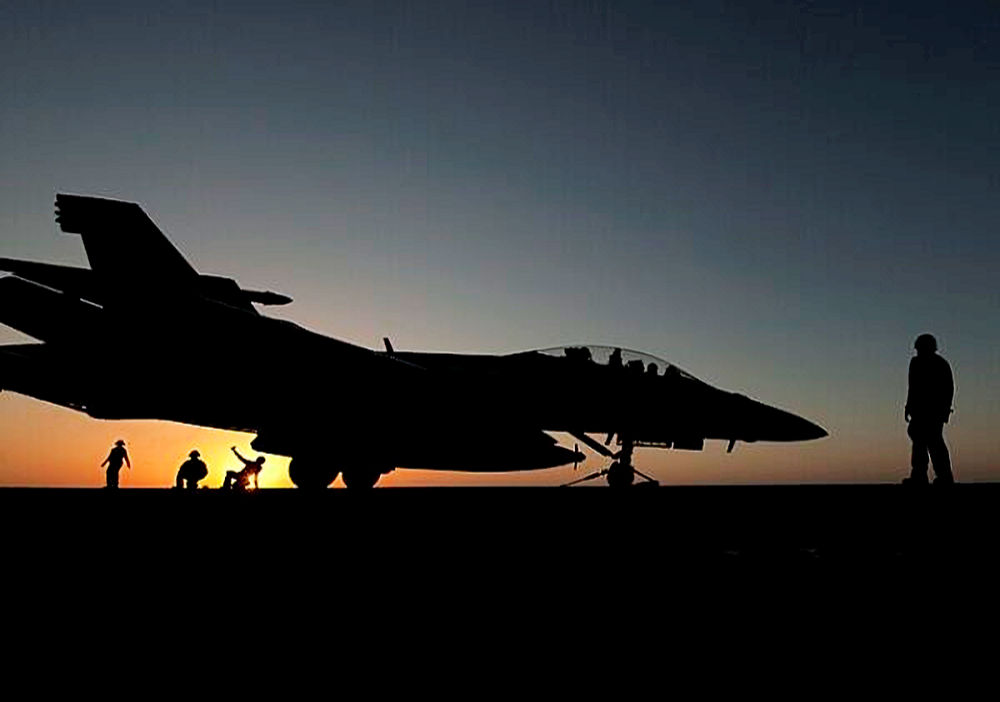 in anteprima Flight deck personnel prepare to launch an F/A-18 F Super Hornet assigned to Strike Fighter Squadron (VFA) 22 on the flight deck aboard Nimitz-class aircraft carrier USS Carl Vinson (CVN 70). Carl Vinson and Carrier Air Wing (CVW) 17 are deployed to the U.S. 5th Fleet area of responsibility. (U.S. Navy photo by Mass Communication Specialist 2nd Class James R. Evans/Released)