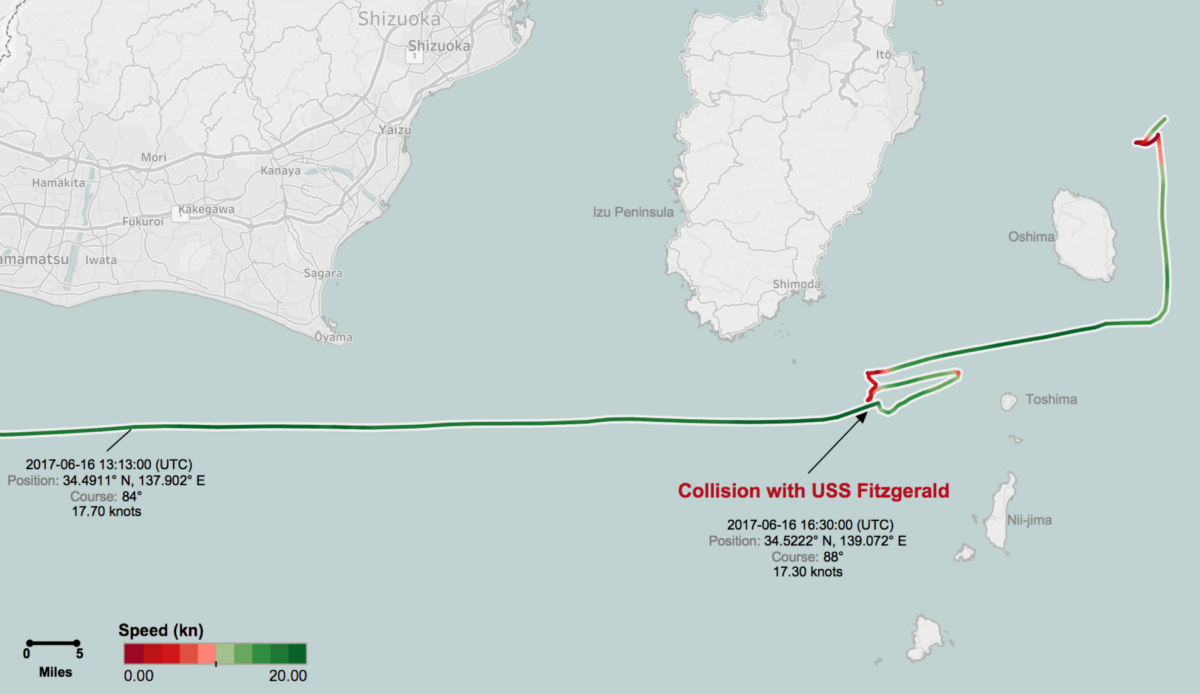 Nella notte del 17 giugno 2017, il cacciatorpediniere della Marina degli Stati Uniti USS Fitzgerald (nella foto seguente – USN da Wikipedia) si scontrò con una nave portacontainer battente bandiera filippina, MV ACX Crystal, a circa 80 miglia nautiche a sud-ovest di Tokyo, Giappone, circa dieci miglia nautiche a sud-est della città di Shimoda, Honshu.