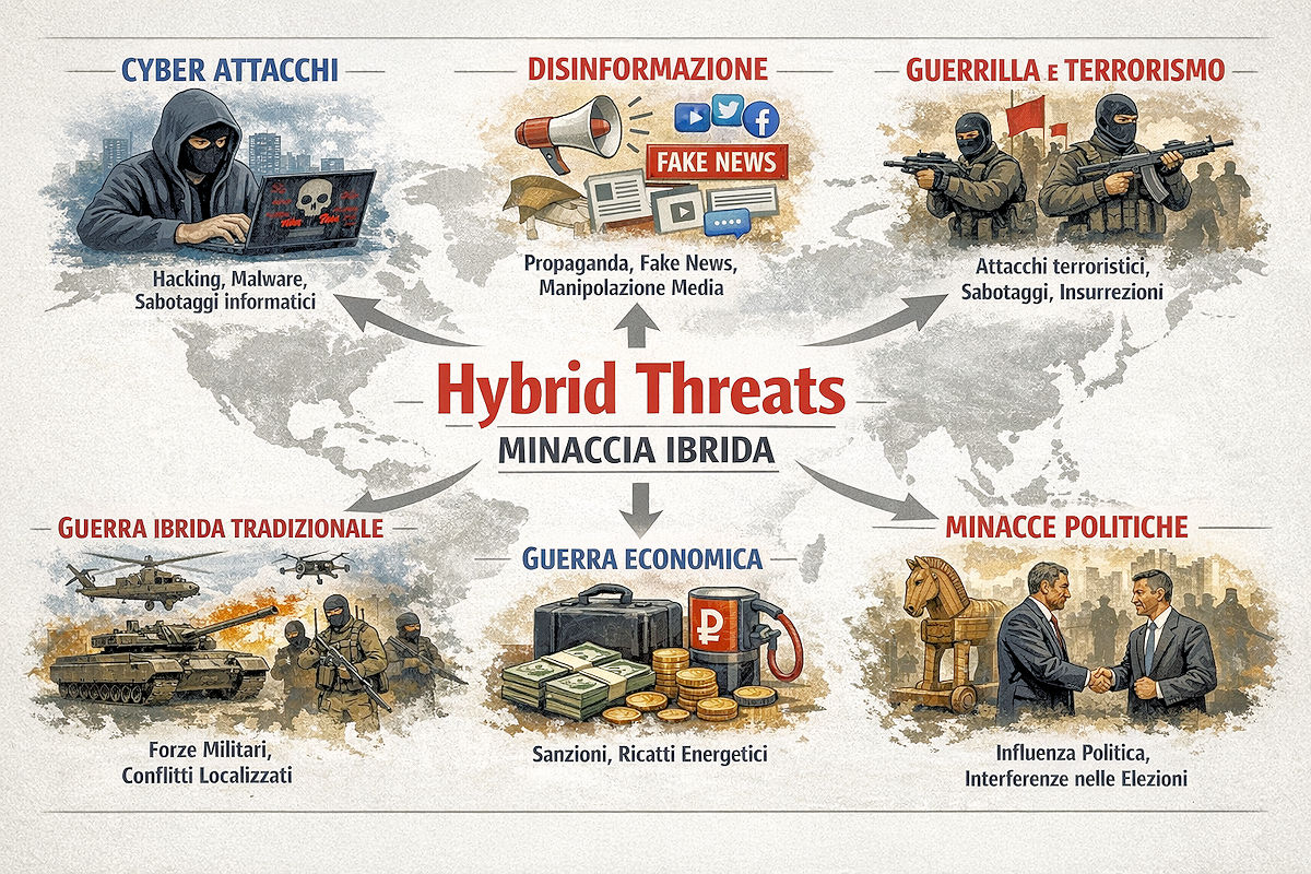 La guerra ibrida, che ne deriva, può essere definita “guerra non lineare” o “guerra ambigua”, in quanto rappresenta una forma di conflitto che inizia e si sviluppa impiegando modalità non tradizionali e talvolta non ben chiare, tra loro spesso diverse dalle ordinarie dottrine di combattimento. Questo caratterizza la forte componente di imprevedibilità che ne deriva, dove le modalità di scontro sul terreno sono superate da azioni condotte su “livelli” diversi, colpendo l’avversario simultaneamente e facendo ampio ricorso a procedure non convenzionali. Non a caso, anziché impiegare “grandi unità di manovra” tradizionali, si privilegia l’impiego di “piccole unità” flessibili, mobili e rapide, spesso prive di insegne di riconoscimento o distintivi nazionali. Questo punto è critico in quanto personale armato non riconoscibile come militare non è protetto dal diritto bellico. Come premesso, il concetto di “Guerra Ibrida”, che deriva dalla minaccia ibrida, si materializzò sui mezzi di informazione quando il Generale d’Armata Valerij Gerasimov, Capo di Stato Maggiore della Difesa Generale delle Forze Armate russe, fu incaricato di condurre le forze impiegate in Ucraina in qualità di “esperto di guerra ibrida”.