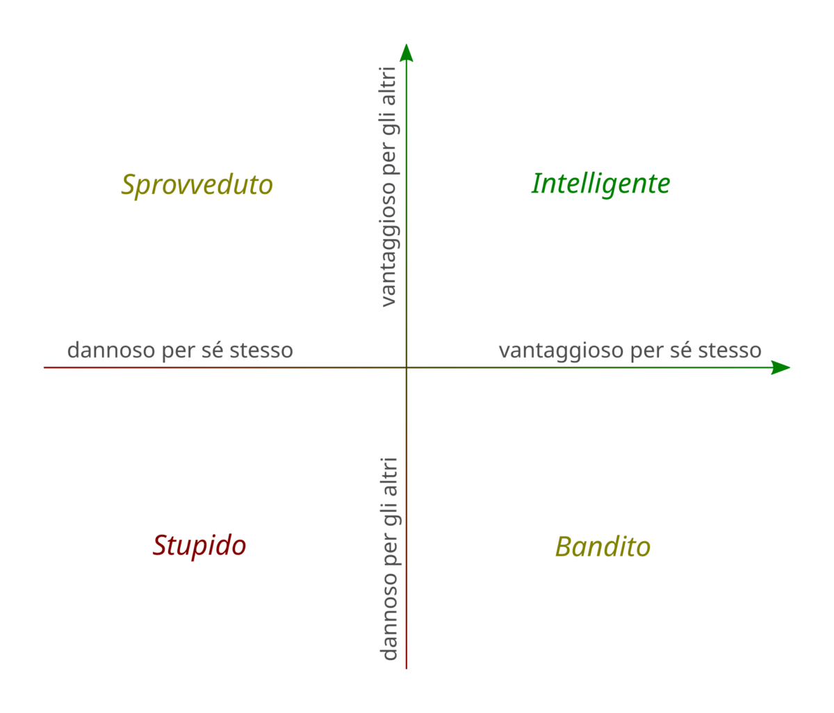 Si può quantificare la stupidità? Voglio ricordare Carlo Cipolla, uno storico ed economista italiano, che ritenne che dietro ai cambiamenti economici in realtà si nascondono gli uomini, guidati nelle loro scelte dalle specifiche caratteristiche personali. Cipolla approfondì il tema della “stupidità umana”, formulando un’interessante teoria – sintetizzata in cinque punti2 – che distribuiva gli esseri umani in quattro categorie: gli Sprovveduti che danneggiano sé stessi e avvantaggiano gli altri, gli Intelligenti che fanno il proprio vantaggio e quello degli altri, gli Stupidi che danneggiano gli altri e sé stessi e i Banditi che danneggiano gli altri per trarne vantaggio. Esse vengono rappresentate in un diagramma da cui si deduce che di fatto ci sono infinite variazioni, rendendo la stupidità non facilmente individuabile e spesso ahimè vincente.