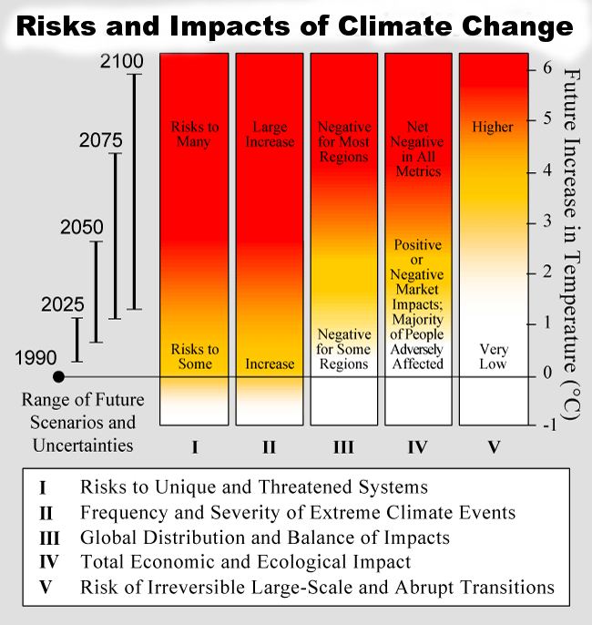 Una valutazione dell’impatto relativo e dei rischi connessi al riscaldamento globale. Vengono valutate cinque categorie. Le barre sono codificate a colori per mostrare il livello di impatto/preoccupazione per ciascun fattore in funzione dell’aumento della temperatura An assessment of the relative impact and risks connected with global… | Download Scientific Diagram (researchgate.net)