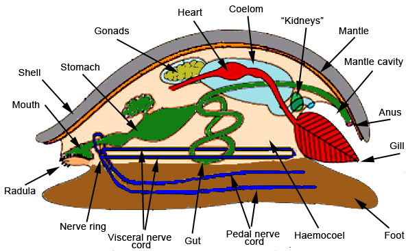 Nella parte interna troviamo la maggior parte degli organi in un sacco dei visceri, in posizione dorsale rispetto al piede muscoloso, che contiene gli apparati principali (digerente, circolatorio , genitale ed escretorio). Come in tutti i molluschi la respirazione è attraverso delle branchie (gill) per via della conchiglia, a causa della poca superficie cutanea a contatto dell’atmosfera e quindi non sufficiente per una respirazione affidata a degli scambi gassosi attraverso il derma.