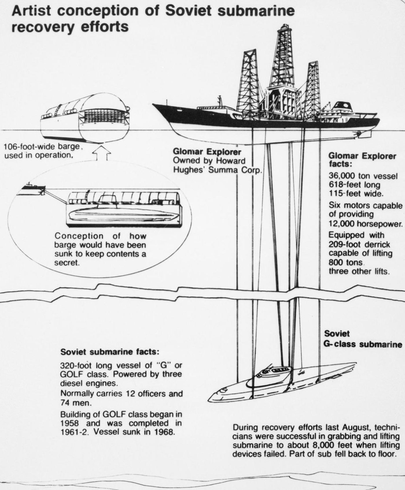 Un articolo di Mark Strauss, pubblicato su IO9, raccontò come nel 1969 la CIA riunì una piccola task force di ingegneri e tecnici per sviluppare nel più assoluto riserbo un progetto per il recupero di un sottomarino sovietico di 2.500 tonnellate sul fondo dell’oceano ad una profondità di 16.500 piedi. Il progetto prevedeva l’impiego di una nave di grandi dimensioni per il recupero del battello. La nave era dotata di una camera interna con un fondo apribile, una specie di “veicolo di cattura” in grado di afferrare il battello sul fondo, e di una piattaforma in grado di immergersi e tornare sotto la nave per il recupero in maniera occulta della sua preda.