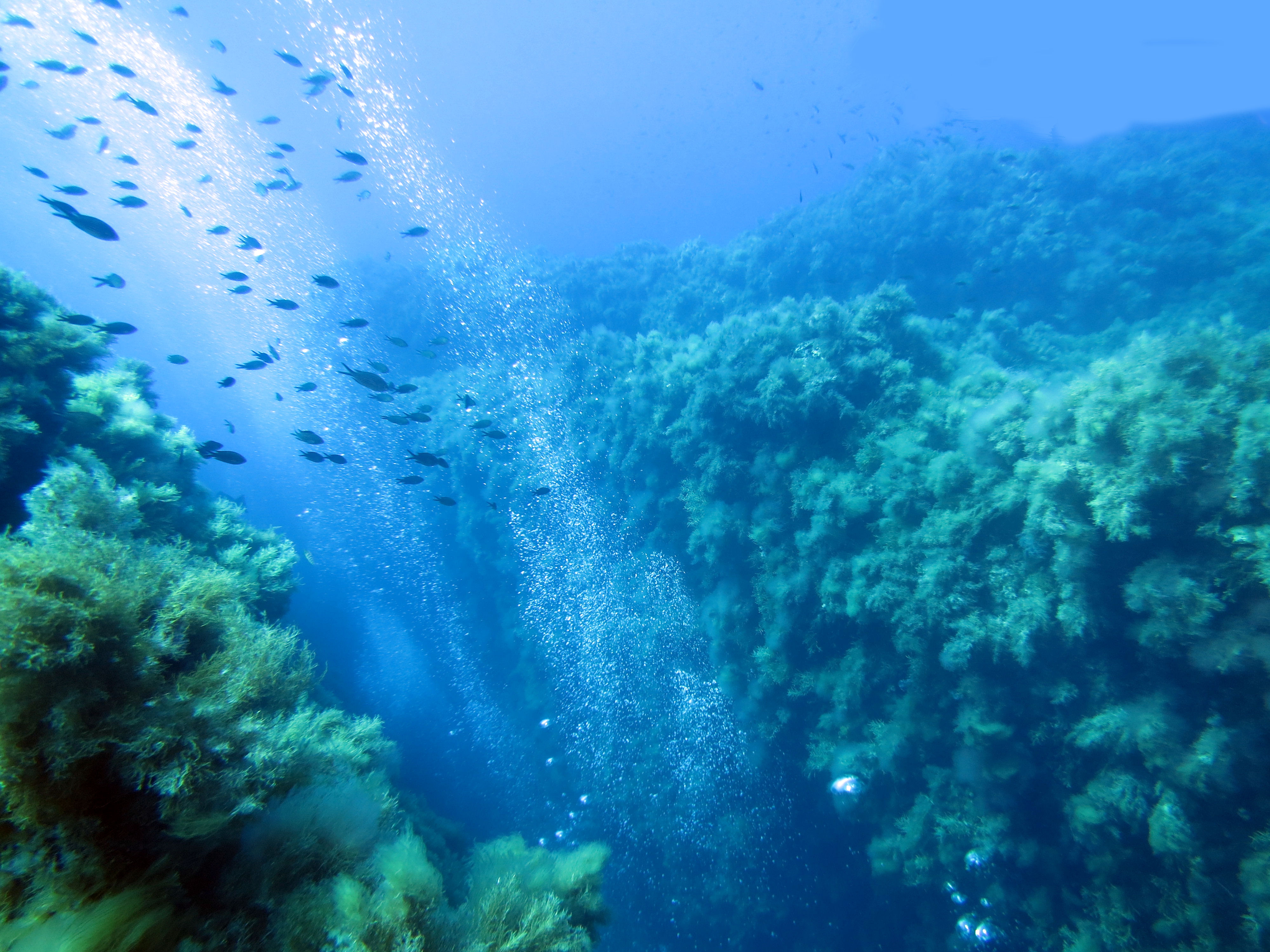 La seconda immersione che vi voglio raccontare è quella sulla secca della Colombara, un cappello ampio come un terrazzo, che offre la possibilità di effettuare diverse immersioni in base al livello di certificazioni ed esperienza. La nostra guida ci dice che, insieme al Secchitello ed allo Scoglio del Medico, rappresenta il top delle immersioni di Ustica: un luogo incredibile tutto da vivere, con acqua limpida e tanto pesce. L’immersione classica parte dal cappello della secca, situato a soli tre metri di profondità, dove la roccia lavica è coperta da una incredibile varietà di alghe verdi e brune.