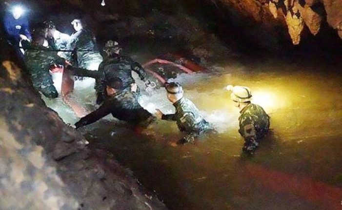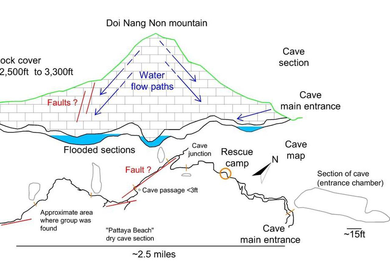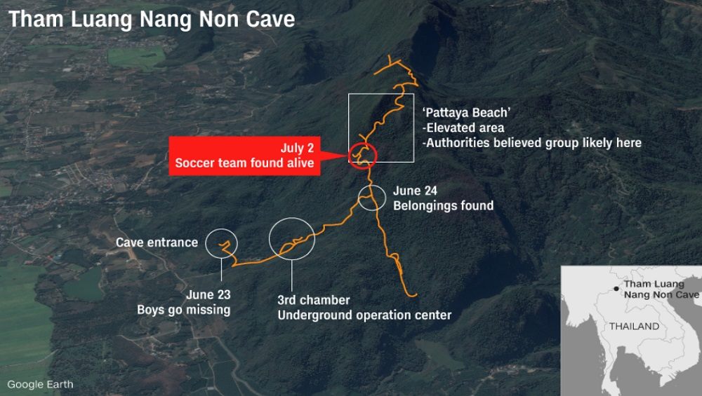 Sebbene manchi ancora quasi un mese all’inizio della stagione dei monsoni una serie di piogge anticipate satura la roccia calcarea delle montagne ed innesca un veloce allagamento della grotta. Per sfuggire alle acque che risalgono rapidamente il gruppo si rifugia in una zona più elevata del sistema carsico a quasi quattro chilometri dall’entrata. Sono in trappola, tagliati fuori dal resto del pianeta da chilometri di meandri oramai percorribili solo dai subacquei. E’ l’inizio di una mobilitazione internazionale senza precedenti nel campo del soccorso speleo-subacqueo; cento subacquei, personale tecnico e logistico di oltre cento agenzie governative, duemila militari, oltre novecento agenti di polizia e migliaia di volontari si uniscono nel disperato tentativo di localizzare e recuperare il gruppo disperso. In totale, si ritiene che quasi diecimila persone contribuiranno alle operazioni.