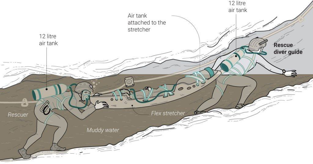 Dopo aver vagliato una serie di proposte si decide di organizzare l’estrazione del gruppo usando tecniche di soccorso speleo subacqueo. Il problema è che non solo i ragazzi non hanno alcuna esperienza subacquea ma molti non sanno neanche nuotare. Per ridurre il rischio che possano entrare in panico, mettendo a repentaglio la loro vita e quella dei soccorritori, i ragazzi verranno parzialmente sedati, dotati di una maschera gran-facciale (che copre tutto il viso e consente di respirare attraverso il naso), imbracati su delle apposite lettighe e trasportati attraverso una serie di passaggi incredibilmente stretti, alcuni larghi meno di 50 cm, immersi in un’acqua melmosa che le idrovore, appositamente installate, riescono solo in parte a contenere. Per rendere possibile questa operazione i soccorritori devono per prima cosa “attrezzare”la grotta predisponendo linee guida lungo il percorso e garantendo un’adeguata scorta d’aria per le quasi tre ore di trasporto.