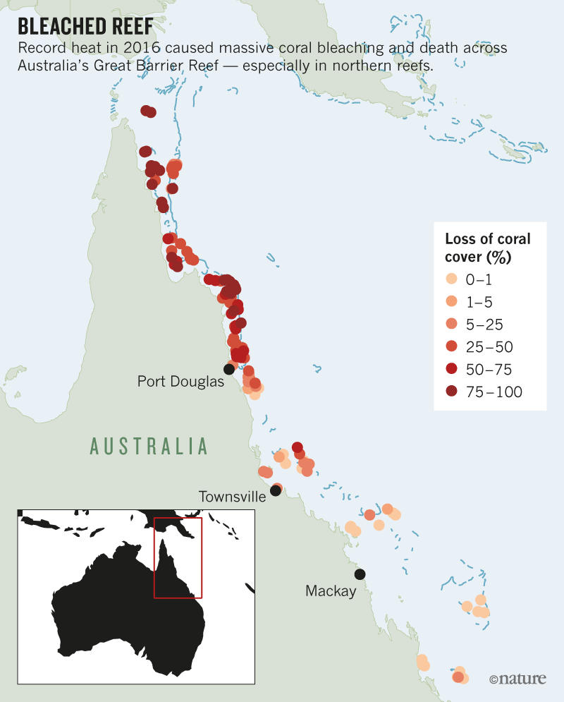 Questo fenomeno si verifica quando il calore eccessivo uccide o espelle le alghe chiamate zooxantelle, che hanno una relazione simbiotica con i coralli che formano la barriera corallina. I coralli quindi muoiono e diventano bianchi. L’aumento della acidificazione degli oceani, dipendente dalle emissioni di carbonio in atmosfera, influenza ulteriormente lo stress ambientale di quei ecosistemi delicatissimi. Molti coralli morirono immediatamente per lo stress da calore. Altri furono uccisi più lentamente, dopo che le zooxantelle furono espulse. Nick Graham, ecologista marino presso la Lancaster University, Regno Unito ha rivelato che sulla Grande barriera corallina, meno del 10% delle barriere coralline è sfuggito al fenomeno, rispetto a più del 40% degli eventi degli anni precedenti. Inutile dire che questo fenomeno fa presagire ciò che potrebbe accadere in futuro alle barriere coralline tropicali a meno di mitigare i cambiamenti climatici e l’innalzamento delle temperature globali.