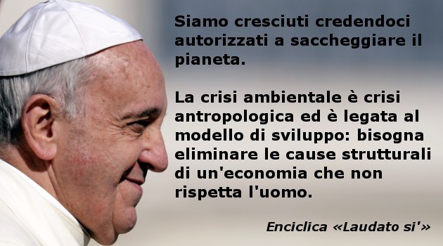 Nella sua Enciclica Laudato Sì, il cui nome deriva dal Cantico delle creature di san Francesco, lodante il Signore per le sue meravigliose creature, Papa Francesco ha chiamato una rivoluzione etica ed economica per prevenire il cambiamento climatico e la crescente disuguaglianza sociale che ne deriverà. In questa enciclica senza precedenti sul tema dell’ambiente, il pontefice sostiene che lo sfruttamento delle risorse del pianeta ha varcato i confini naturali e il mondo deve affrontarne le conseguenze cambiando l’attuale tendenza, in altre parole attuando una  profonda rivoluzione nei cuori e nelle menti. Il tanto atteso messaggio, inviato ai 5.000 vescovi cattolici del mondo, è stato pubblicato il 24 maggio  in cinque lingue ma reso noto solo il 18 giugno. Si prevede che questa enciclica sarà giudicata come la più radicale mai fatta da un pontefice. E’ certo che farà arrabbiare sezioni dell’opinione repubblicana negli Stati Uniti d’America, approvando di fatto gli avvertimenti degli scienziati sul clima disattesi dall’attuale Governo di Trump.