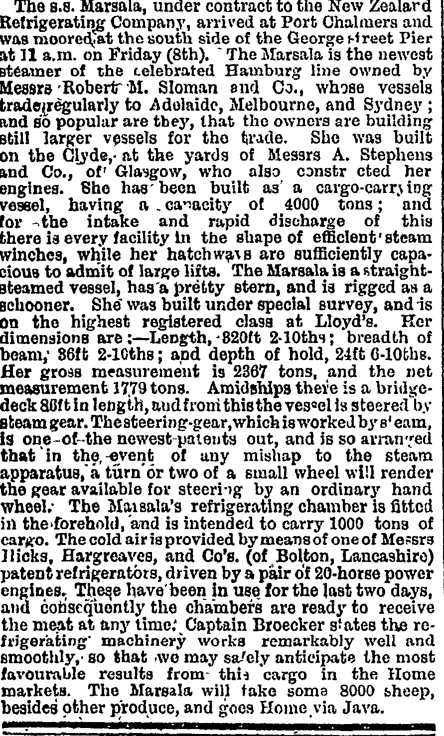 La nostra storia inizia a Glasgow, Scozia, nei cantieri navali Alexander Stephen & Son. Il 5 marzo 1882 avviene il varo dell’S.S. Marsala, “steam ship” adibita al trasporto persone oltre oceano. L’armatore è la compagnia tedesca Australia-Sloman Line A.G. che costituisce una flotta commerciale per l’Australia e la Nuova Zelanda.