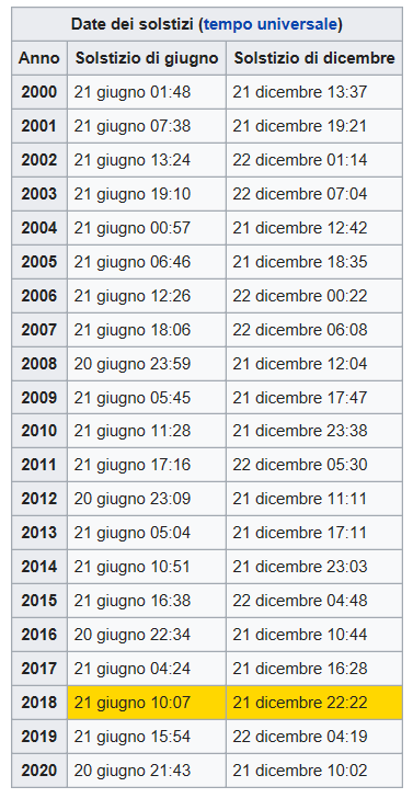 In realtà tale condizione si verifica, dati astronomici alla mano, nel giorno del Solstizio (di inverno nel nostro emisfero o di estate nell’altro) che cade invece il 21 o il 22 di dicembre (quest’anno 2019 il 22). Nella tabella a lato potrete vedere le sue oscillazioni.