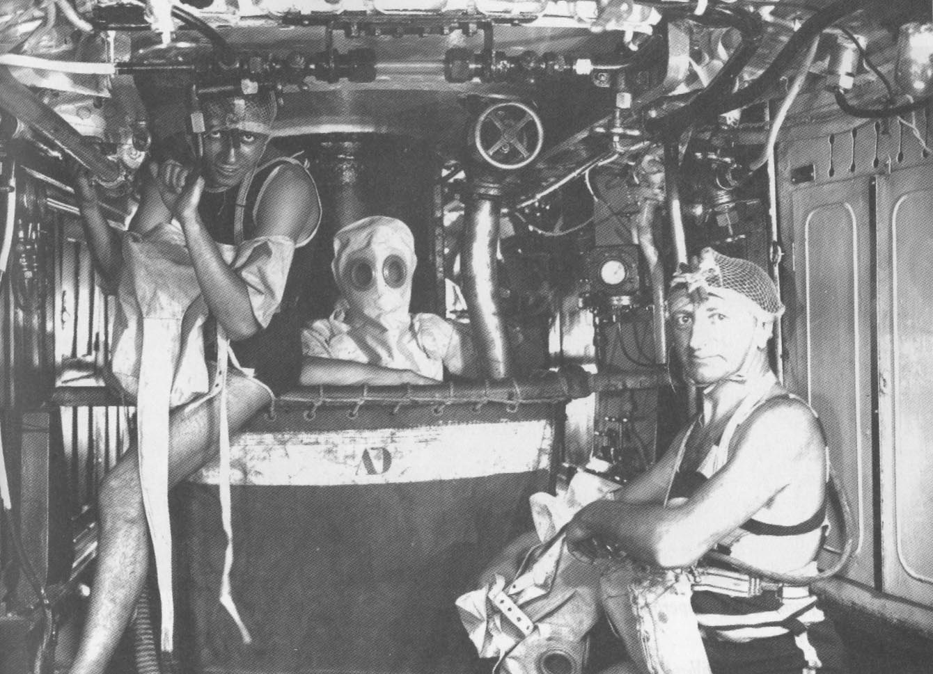 Belloni, con la retina in testa, all’interno di un sommergibile dove si stava collaudando la “Vasca Belloni” per la fuoriuscita. La Fiat San Giorgio lo assunse con il compito di collaudare e consegnare i sommergibili che venivano costruiti nel cantiere del Muggiano di La Spezia