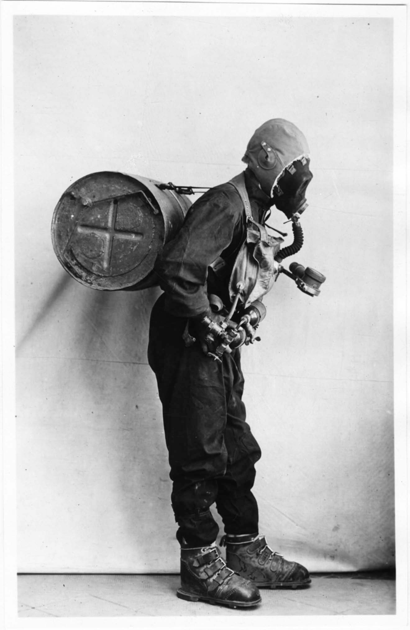 Il “marciatore sul fondo” era un sommozzatore con ARO a grande autonomia, vestito Belloni, scarpe zavorrate con puntale dentato in bronzo e cappuccio sempre Belloni. Sulla schiena portava una carica esplosiva costituita da una “bomba torpedine da getto” del peso di 50 Kg e munita di spoletta a orologeria. L’idea si dimostrò irrealizzabile perché era in pratica impossibile riuscire a marciare sul fondale per distanze così lunghe e mantenere una condizione accettabile di efficienza per l’operatore (Archivio Ufficio Storico Marina Militare)